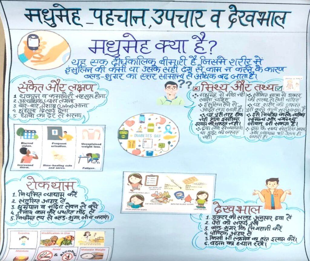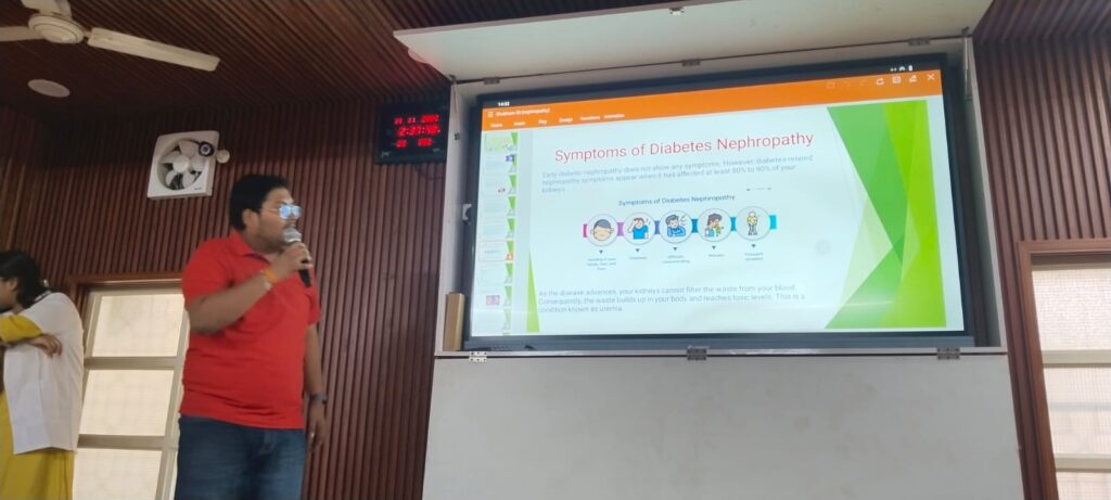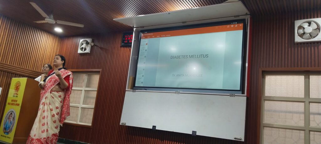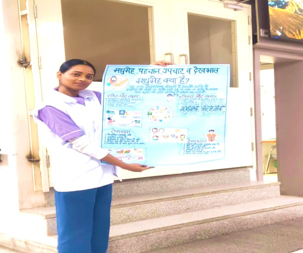 Gayatri, a student of GNM 1st Year, led the health education talk and explained the early signs and symptoms of diabetes in a simple and easy-to-understand manner. She also addressed common myths associated with diabetes and emphasised practical preventive measures such as maintaining a balanced diet, engaging in regular physical activity, managing stress, and monitoring blood sugar levels periodically.